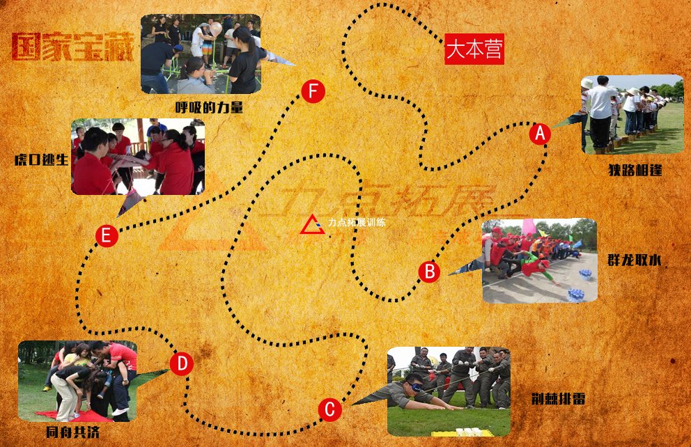 將團(tuán)隊(duì)分成N小組,每小組所需完成的任務(wù)由尋寶路線示意圖、尋寶任務(wù)書、和定點(diǎn)教練布置的闖關(guān)任務(wù)組成。
